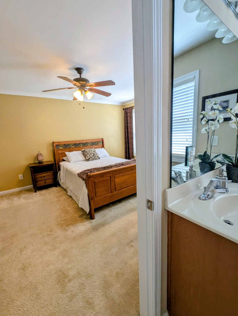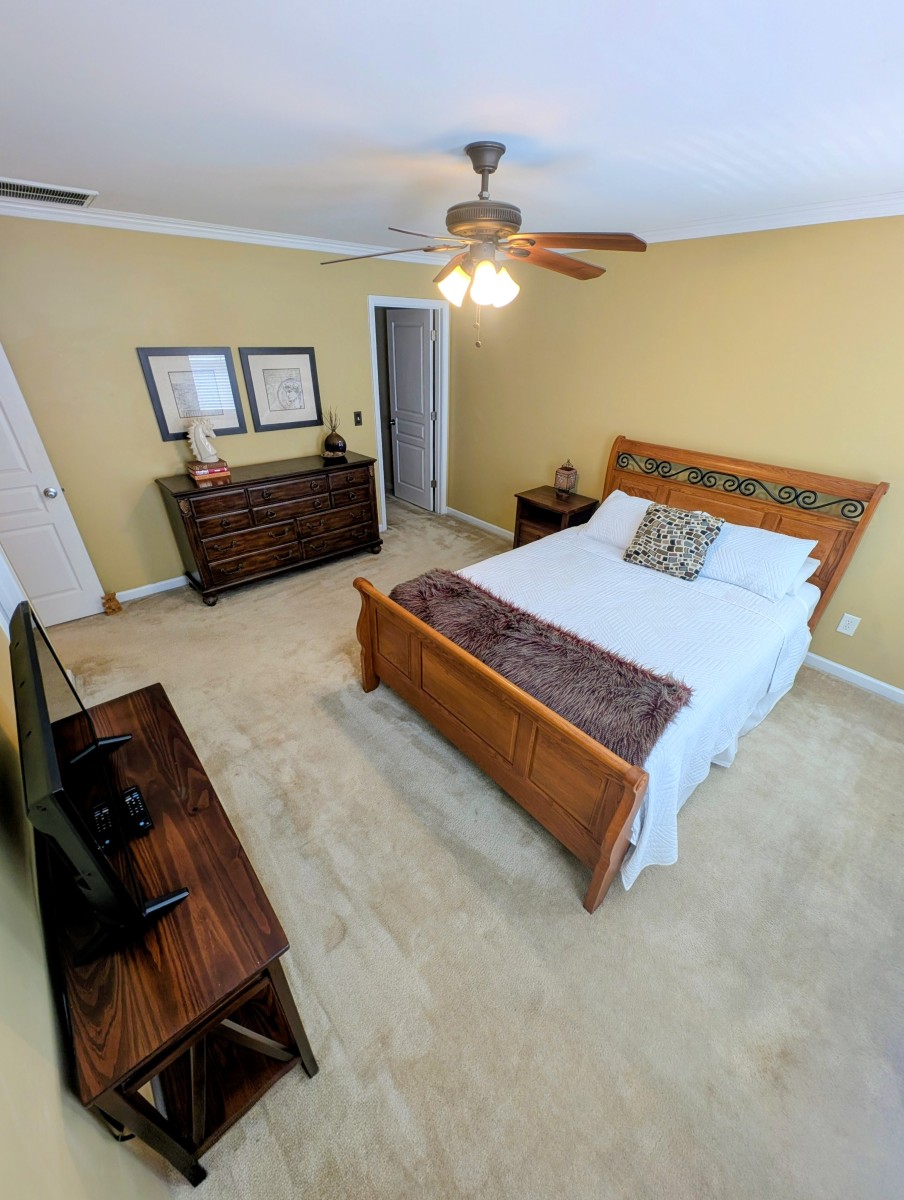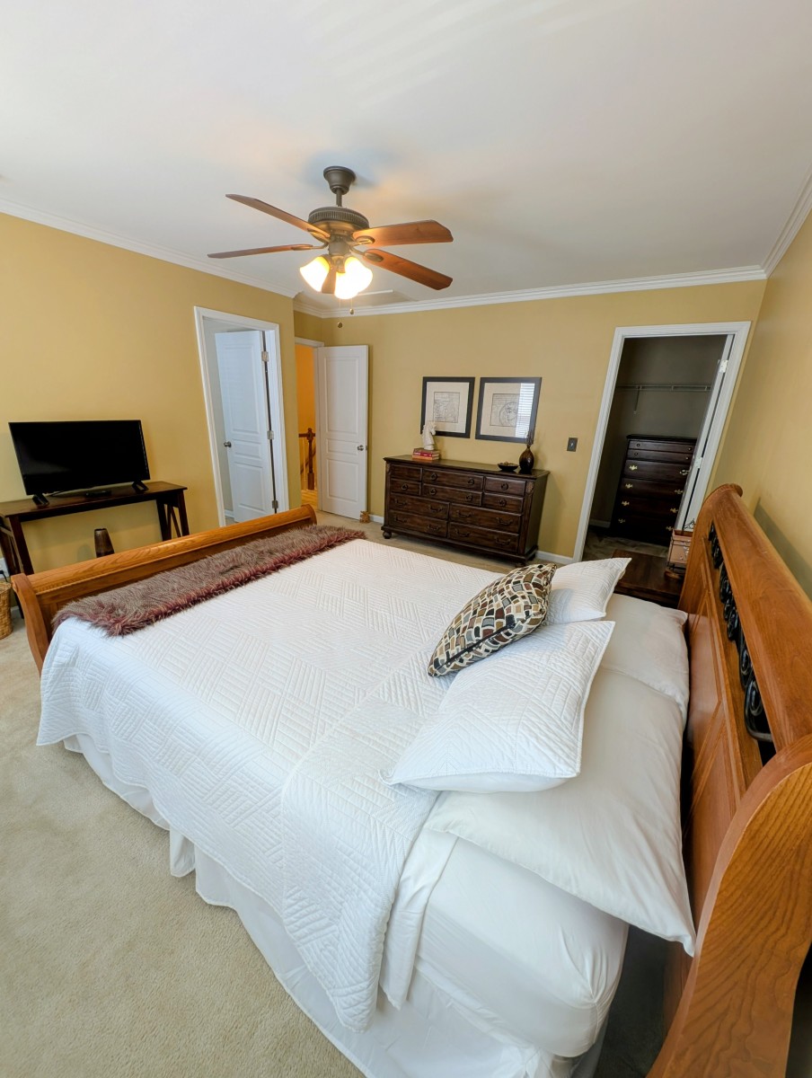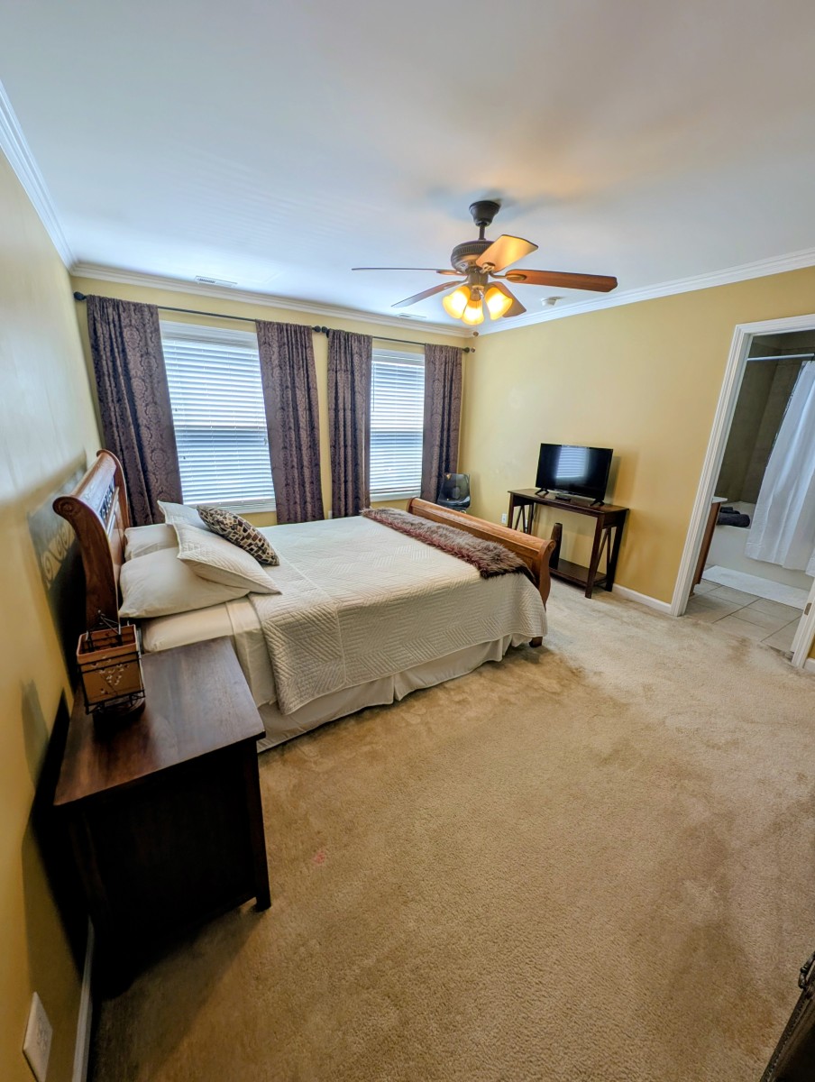 Furnished large master suite with queen bed, dresser, night stand, sitting area, Smart TV and walk-in closet. En suite bath with dual vanities and large tub/shower.